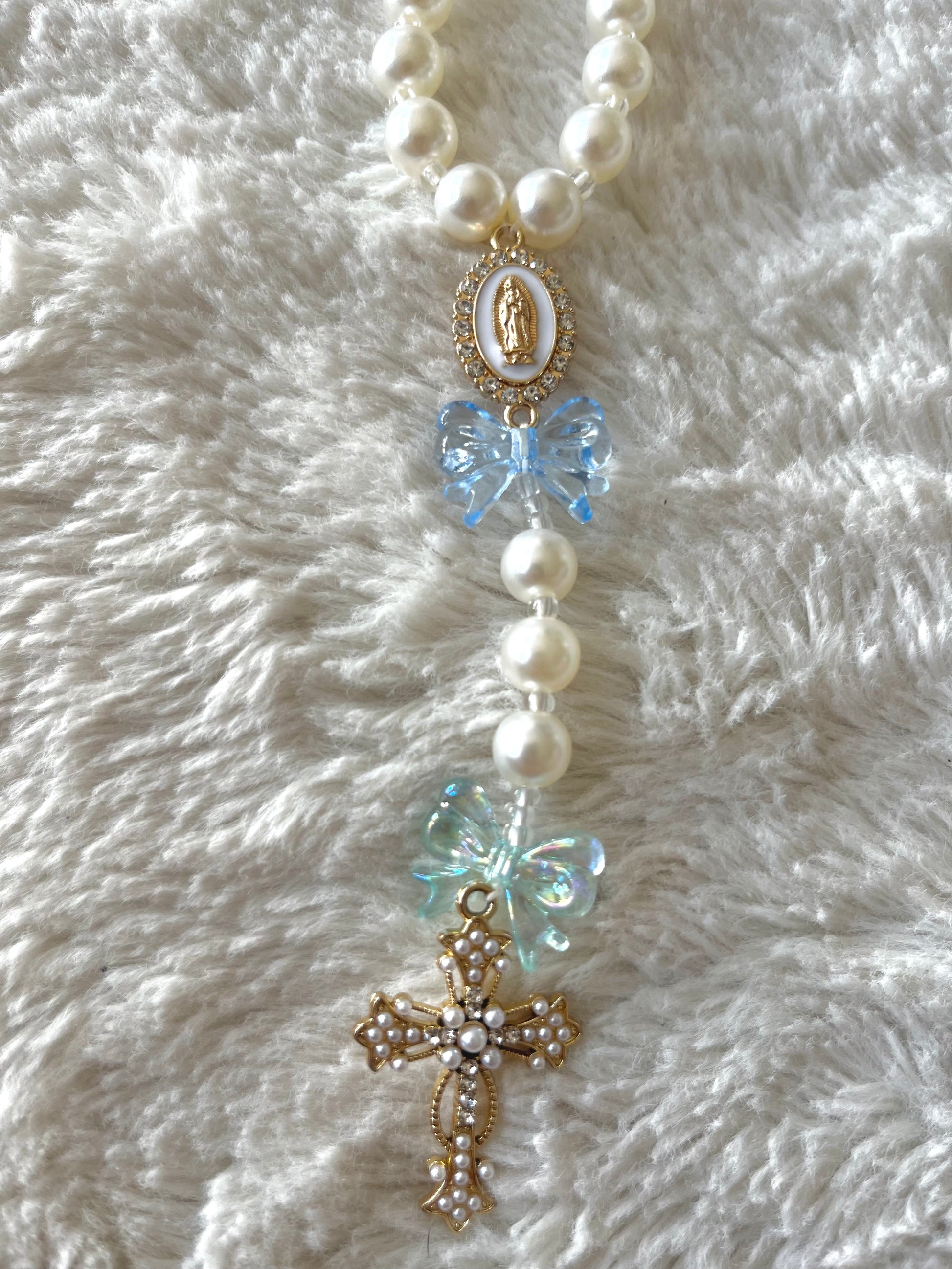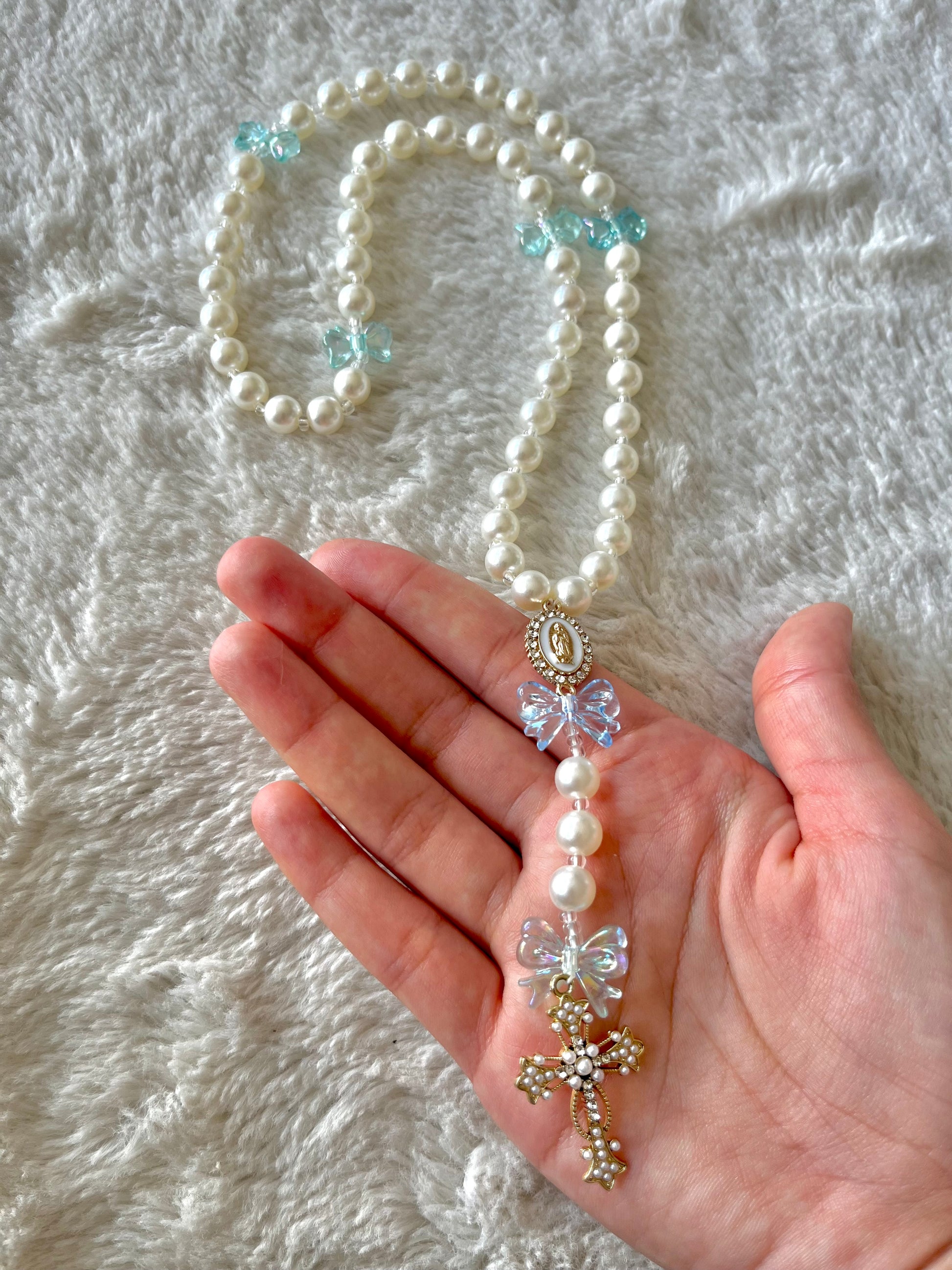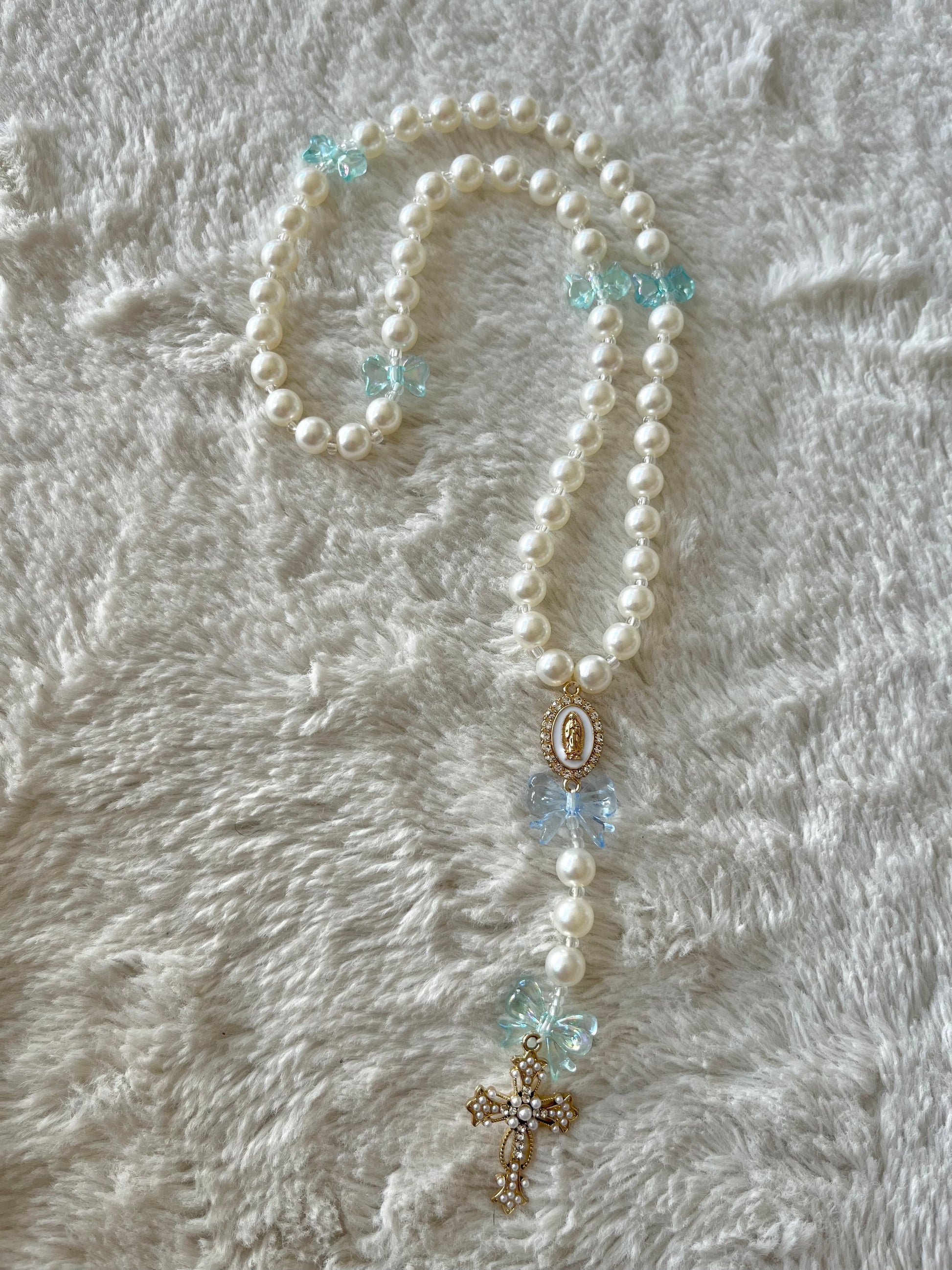 Ses perles nacrées blanches rappellent la pureté et la paix intérieure, tandis que ses nœuds en cristal bleu translucide évoquent l’élégance et le lien sacré entre l’âme et Dieu. La croix dorée ornée de perles précieuses apporte une touche raffinée et intemporelle.