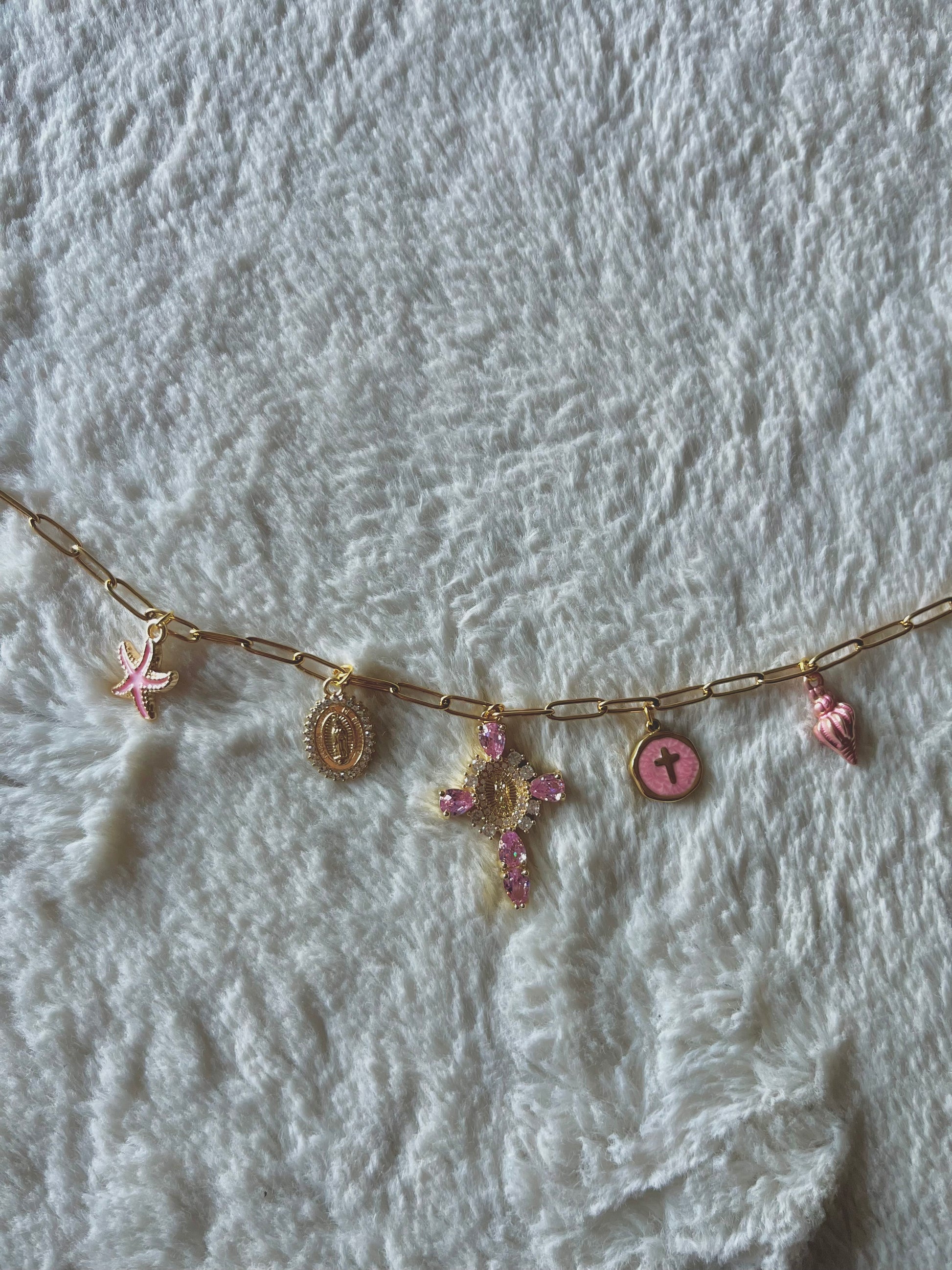 Ce collier doré met en valeur une harmonie de pendentifs roses et dorés, chacun porteur de symbolique :